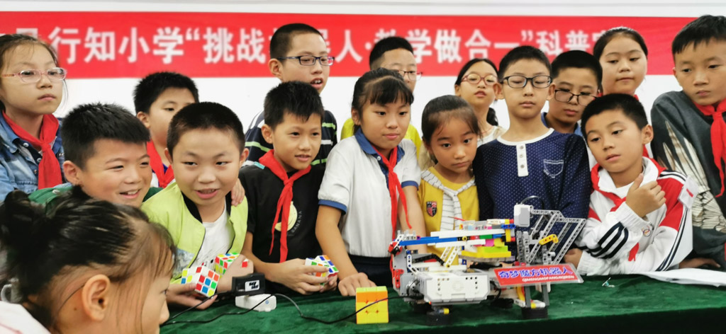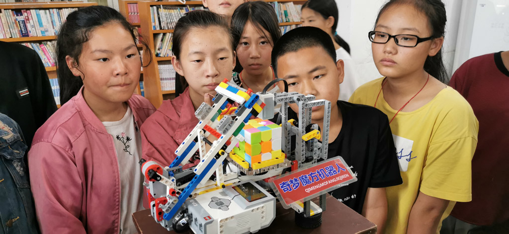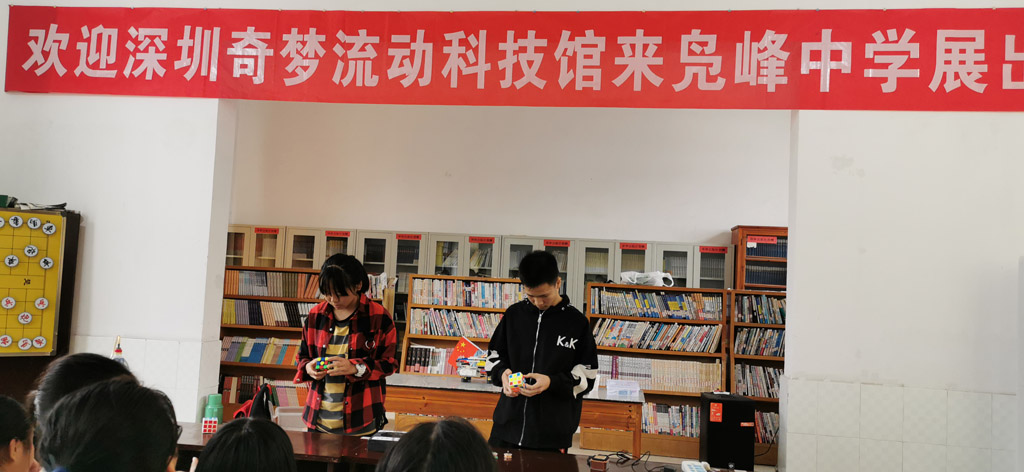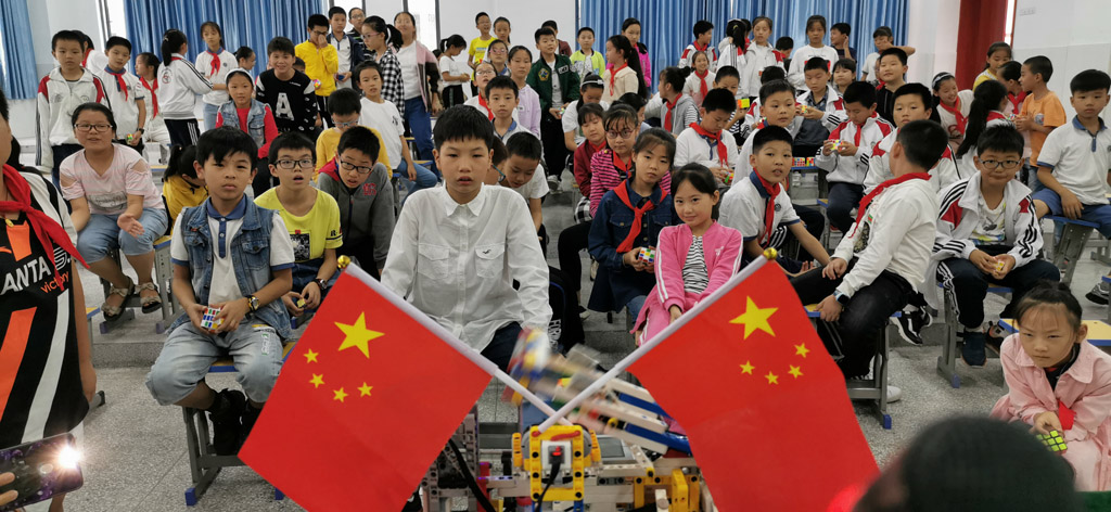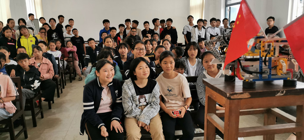 2019-10-13 安徽省黄山市祁门县凫峰中学的学生们在挑战魔方机器人,并仔细观看魔方机器人的表演